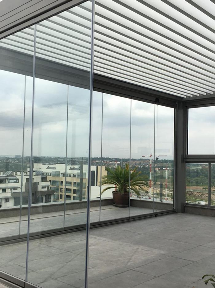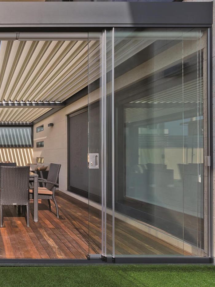 La cortina de Cristal, permite cerrar Balcones, Terrazas, Quinchos, Galerías, etc. con Aluminio y Vidrios de Seguridad de 10 mm, no permite el ingreso de viento ni polvo, logrando obtener un ambiente más en los domicilios.