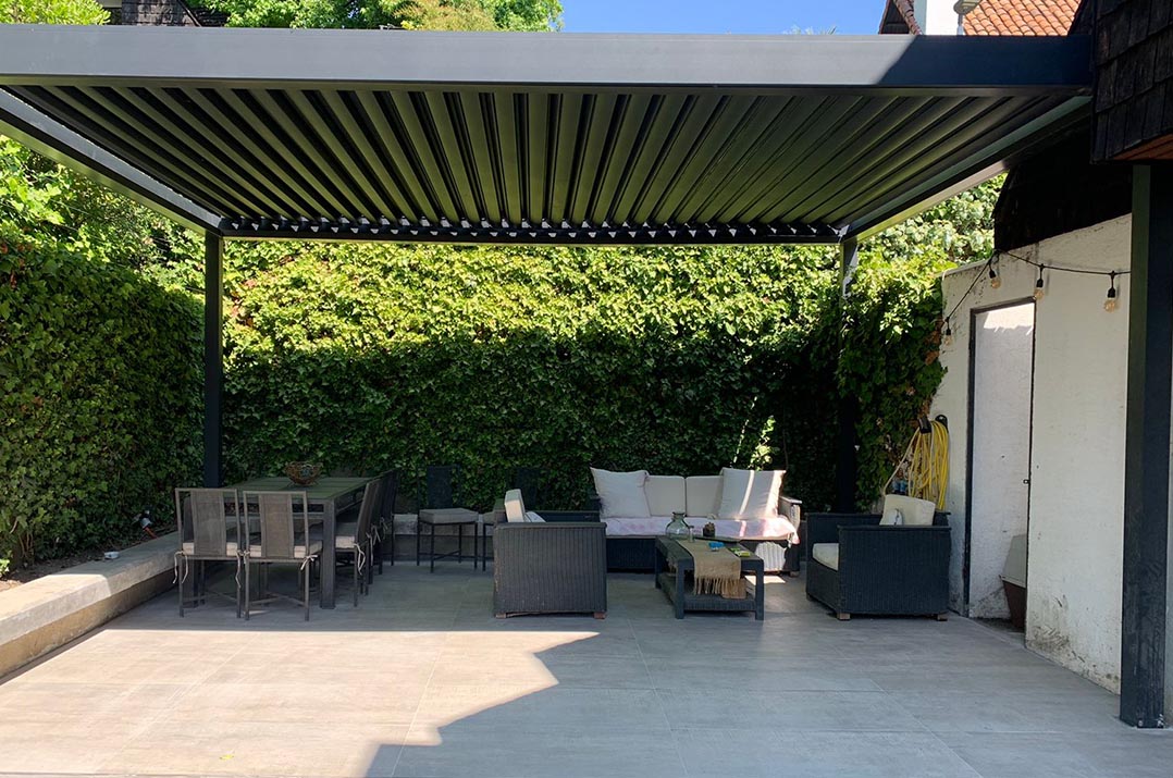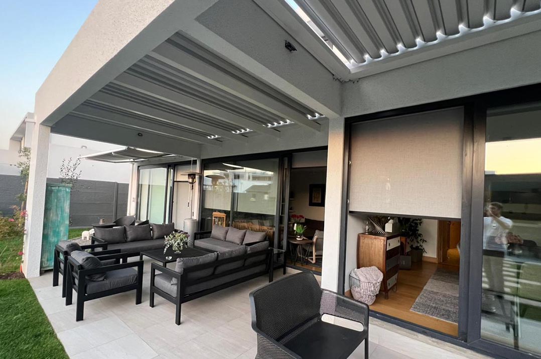 Personaliza tu pérgola con lamas orientables y cortinas enrollables para mayor confort y elegancia.